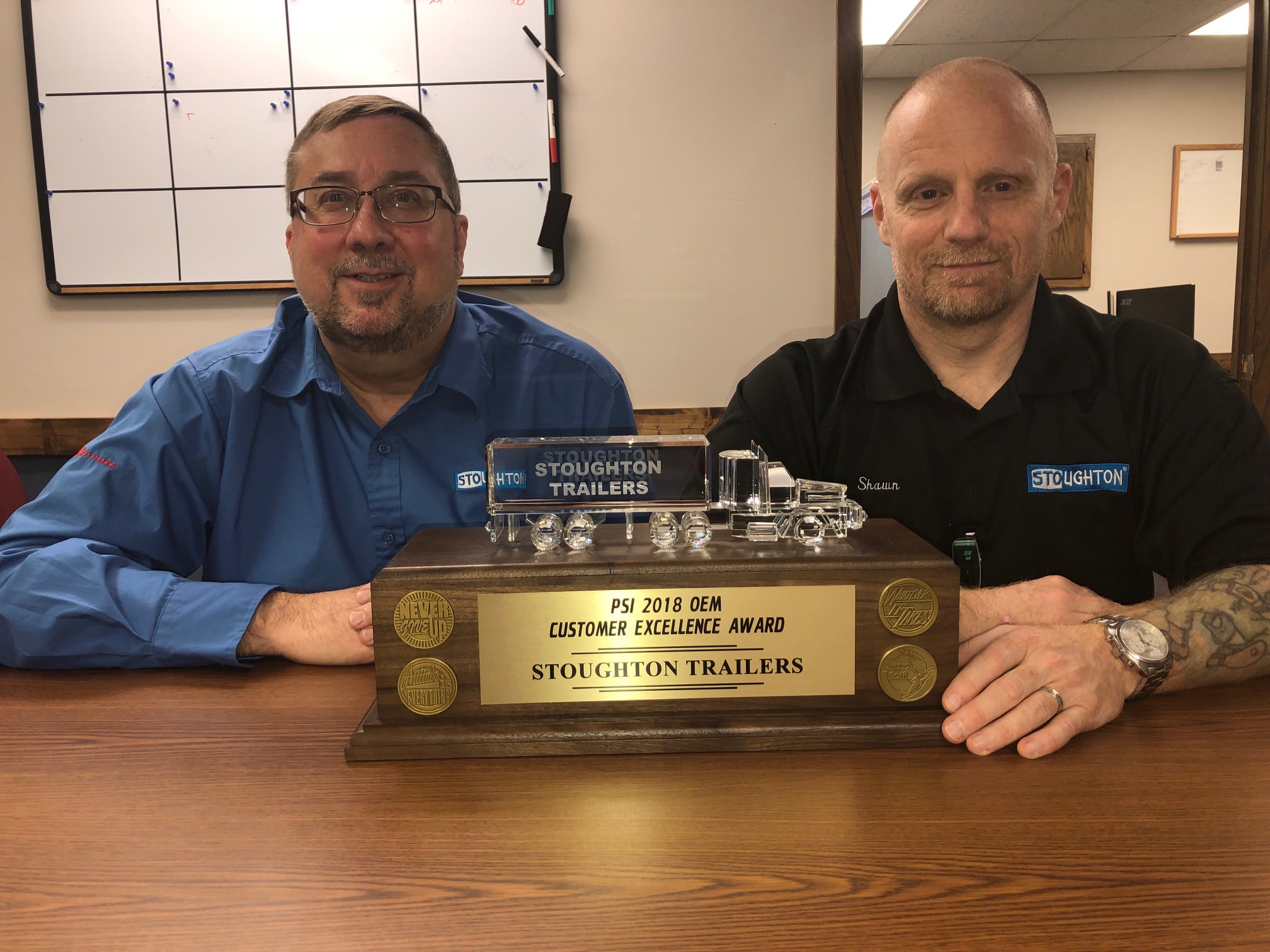 At the most recent Truck Trailer Manufacturers Association (TTMA) meeting, Stoughton Trailers had the honor of receiving the prestigious OEM Customer Excellence Award from Meritor/P.S.I.. The annual award recognized the trailer manufacturer that had installed the highest percentage of trailers with the Meritor Tire Inflation System (MTIS™) in 2018. The MTIS™ provides important safety and environmental benefits by keeping tires properly inflated to reduce wear, increase fuel economy and alerts drivers to overheating wheel ends.